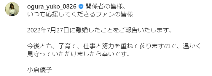 タレントの小倉優子が7月27日に自身のインスタグラムを更新し離婚したことを発表しました。