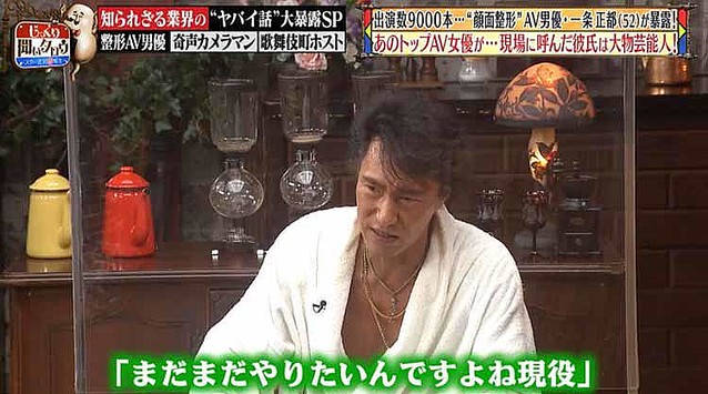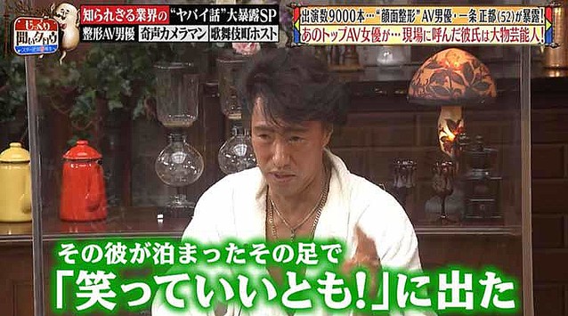 A◯男優の一条正觥は、出演本数9000本、抱いた女優は1万人というレジェンドと呼ばれています。番組の収録当日も撮影をしてきたという彼は、52歳でありながら今も現役バリバリの人気男優です。