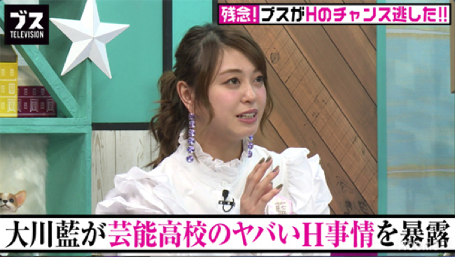 「向こうもいい感じかもっていうのが入ってきたんですけど、芸能学校だったんで一言で噂になっちゃうんでお互い何もできず何もなく終わっちゃいました」とアイドルらしい綺麗事に終始する大川のつまらないコメントに、おぎやはぎの矢作兼が「ばんばんヤってそうなイメージがある」と突っ込むと、パスを受けた大川藍は「でも、ヤってる子はヤってました!」と言います。