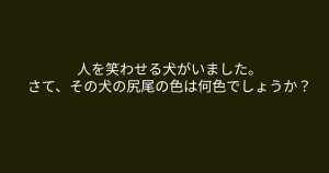 ”人を笑わせる犬” 頭を柔軟にして解かないと一生解けない問題 今回ご紹介するのは脳トレクイズです。 問題 人を笑わせる犬がいました。 さて、その犬の尻尾しっぽの色は何色でしょうか? Google ADVERTISEMENT Google あなたはわかりましたか? それでは答え合わせに行きましょう! Google 答えは、、、「白色」 ADVERTISEMENT 人を笑わせると言うことは、「面白い犬」だったと言うことです。面白い犬だけに、「尾も白い犬」でした。 Google ADVERTISEMENT あなたは間違えずに解けたでしょうか! Google [著作権者VONVON /無断コピー、無断転載および再配布禁止(違反時の法的措置)] ADVERTISEMENT