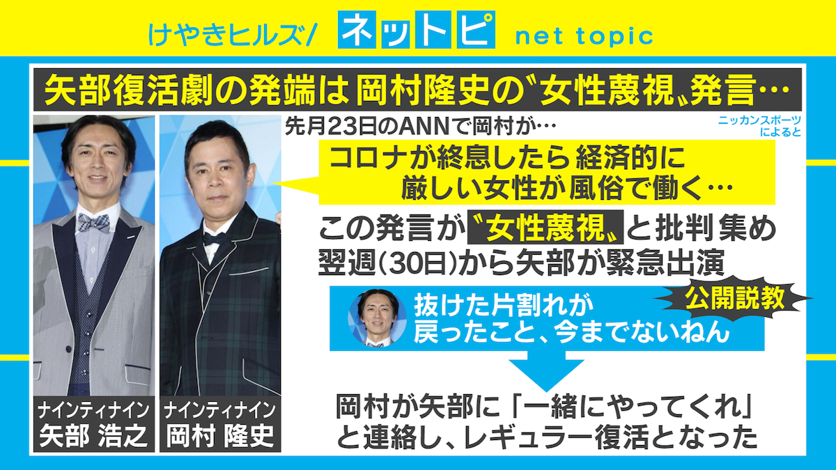 つい2か月前、相方の岡村さんが「ナインティナイン岡村隆史のオールナイトニッポン(ANN)」(ニッポン放送)の放送中に〝女性蔑視発言〟をし、謝罪に追い込まれたばかり。矢部さんは、翌週の4月30日深夜放送で岡村を公開説教したのも記憶に新しいはずです。