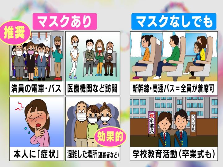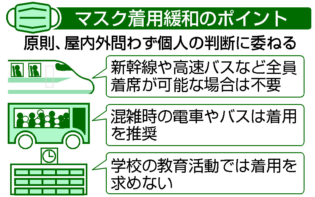 「今回の見直しは全国民や事業者に関わる。円滑に行われるよう万全な準備を進めたい」と述べており、指針では、新幹線や高速バス内でのマスクを不要とする一方、混雑する電車やバス内では引き続き着用を推奨するとのこと。