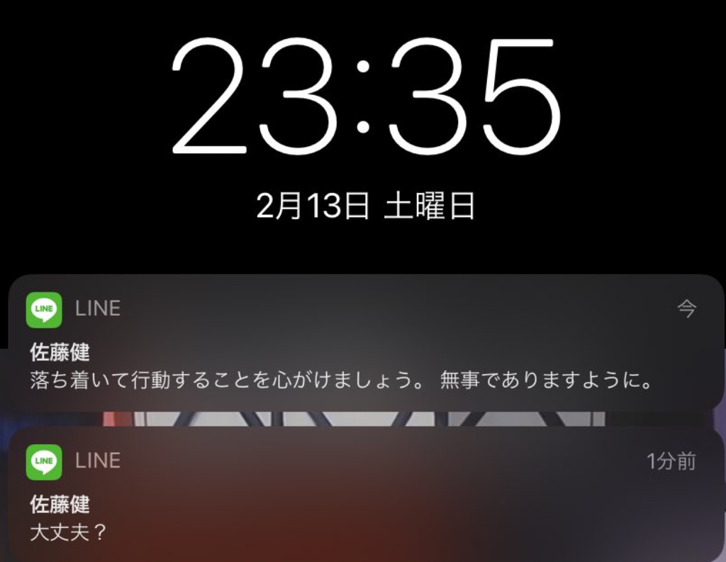 地震発生からわずか30分。佐藤健さんの公式LINEからのメッセージは一言、「大丈夫?」と届いたようで、続けて「落ち着いて行動することを心がけましょう。無事でありますように」と心配する言葉が。