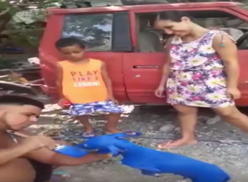 おかげで全身真っ青に染まってしまった飼い犬。しっぽはお腹にくっついており、飼い犬はどれだけ恐怖を感じたことが想像するだけでも心が痛いですね。さらに、周りにいた子どもたちをはじめとした人々は止めるどころか一緒に見ては笑っているのが動画で確認できます。