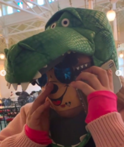 「#直美さんにお洋服借りておソロで行ったのよー」とハッシュタグを添えて、ライトアップされたシンデレラ城をバックにした2ショットなど多くの写真をアップした横澤さん。2人はミッキーが大きくプリントされた色違いのセーターにブルージーンズを合わせ、「トイ・ストーリー」シリーズの恐竜・レックスのかぶりものにサングラス、口元にはミッキーの口がプリントされたマスクと、どうしたって目立つディズニーコーデを披露しています。頭部の情報量すごいです。