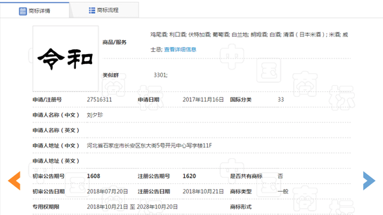 また、中国の商標登録のデータベースで「令和」をキーワードに調べたところ、「令和」という商品名を使用している企業が複数見つかりました。