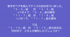 ペアを組んだ数同士を足し合わせ、その数と、対戦相手の数との比を答える問題です。