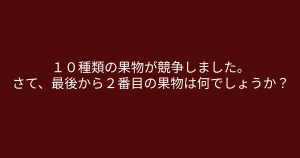 ”最後から2番目の果物は、、、?” 果物を想像すれば誰でも解けるクイズ問題!? 今回ご紹介するのは脳トレクイズです。 問題 10種類の果物が競争しました。 さて、最後から2番目の果物は何でしょうか? Google ADVERTISEMENT Google あなたはわかりましたか? それでは答え合わせに行きましょう! Google 答えは、、、「キウイ」 ADVERTISEMENT 10種類で競争したので、最後から2番目の順位は「9位」です。9位だけに、「キウイ(9位)」が答えになります。 ADVERTISEMENT Google あなたは間違えずに解けたでしょうか! Google [著作権者VONVON /無断コピー、無断転載および再配布禁止(違反時の法的措置) ADVERTISEMENT