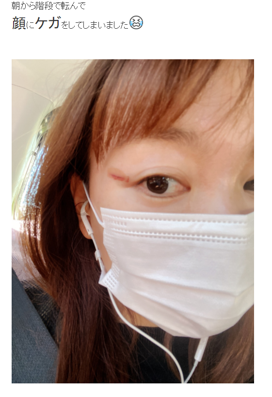 「朝から階段で転んで顔にケガをしてしまいました」と、目元に怪我を負った顔写真を公開したのでした。「年齢を重ねてきたせいなのか…転んだ時にパッと手をつけなかった〜」と説明しました。