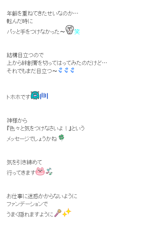 続けて「結構目立つので上から絆創膏を切ってはってみたのだけど…それでもまだ目立つ」と困っている様子で述べ、「神様から『色々と気をつけなさいよ!』というメッセージでしょうかね」とコメントしました。