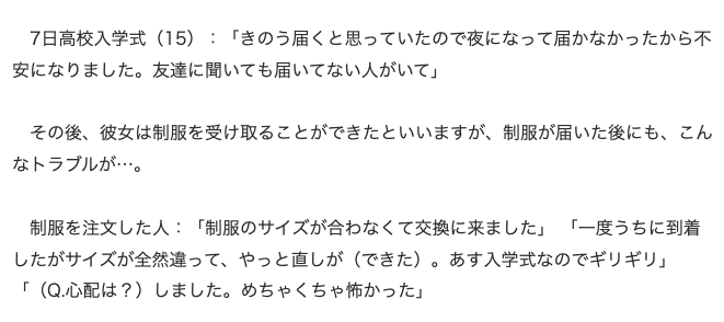6日に届くはずだった制服が到着せず、不安になっていたが幸いギリギリに到着するものの、サイズが違う制服が届き、慌てて直したという笑えないハプニングを経験したとのことです。