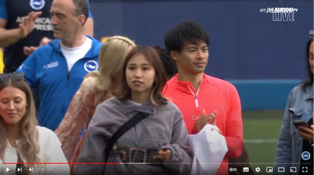 ホーム最終節後のセレモニーには妻で陸上選手のクリアさんと参加した三笘は、ブライトンの公式YouTubeチャンネルでは、三笘がクリア夫人とスタジアム内を歩く様子が公開されています。