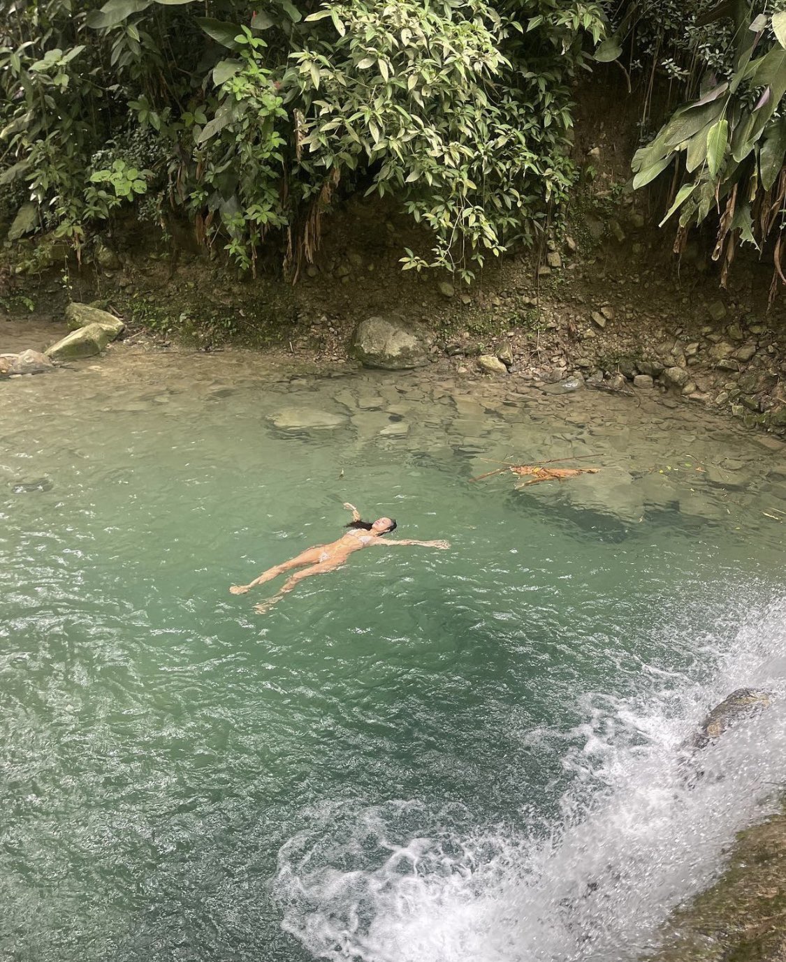 最新のインスタグラムでは葉っぱの絵文字をつづり、写真4枚を投稿しました。かなり小さめのビキニで、肌の大部分があらわになっています。こんがりと焼けた小麦色の肌がとても美しいですね。エメラルドグリーンの川で泳ぐ姿もかなり気持ちよさそうです。
