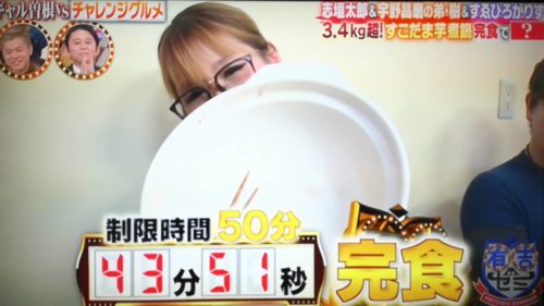 ご飯もきれいに食べきり「ごちそうさまです」と両手を合わせたが、スペアリブの骨とエビのしっぽは残ったままでした。そのせいかギャル曽根が皿を立ててカメラに見せるシーンもなかったです。