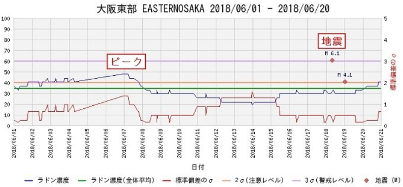 地中から放出されるラドンガスの濃度が地震発生前に上昇することは、多くの科学者が認めていることです。大阪北部地震の約1週間前、観測点のラドン濃度がピークに達し、その後は下降に転じると発生3日前に最低レベルを記録、そして18日の大地震につながったようです。