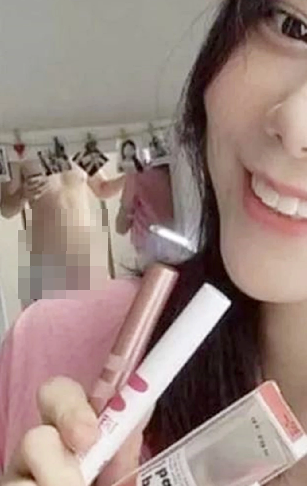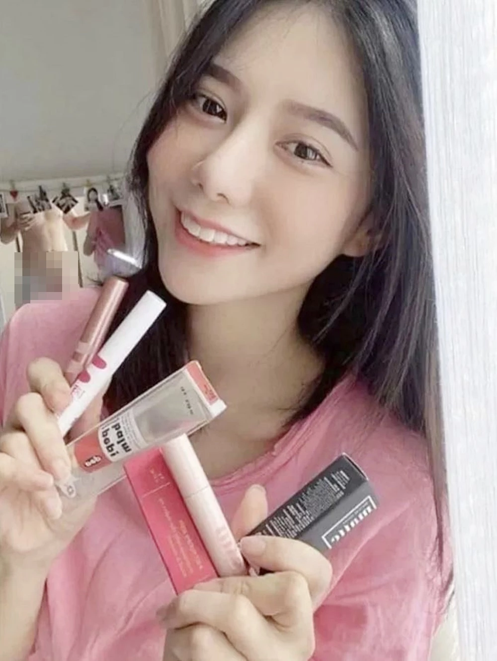 写真の中では、長い髪の毛をした美貌の女性セレブが、カメラに向かって微笑みながら、両手に化粧品を持っています。