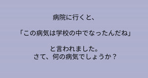 ”この病気は学校の中でなったんだね” 問題文のある部分に注目すると答えが見てくるかも? 今回ご紹介するのは脳トレクイズです。 問題 病院に行くと、 「この病気は学校の中でなったんだね」 と言われました。 さて、何の病気でしょうか? Google ADVERTISEMENT Google あなたはわかりましたか? それでは答え合わせに行きましょう! Google 答えは、、、「口内炎」 ADVERTISEMENT 学校の中のことを「校内」と言います。校内での病気だけに「口内炎」が答えになります。 Google あなたは間違えずに解けたでしょうか! ADVERTISEMENT Google [著作権者VONVON /無断コピー、無断転載および再配布禁止(違反時の法的措置)