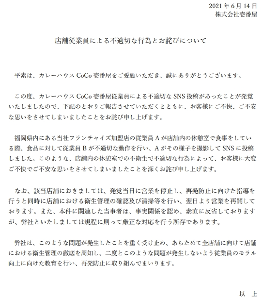 壱番屋は14日昼過ぎに、「店舗従業員による不適切な行為とお詫びについて」のタイトルで公式サイトにお知らせを出しました。「従業員による不適切な SNS 投稿があったことが発覚いたしました」と報告し、「このような、店舗内の休憩室での不衛生で不適切な行為によって、お客様に大変ご不快でご不安な思いをさせてしまいましたことを深くお詫び申し上げます」と謝罪しました。 発覚当日に店の営業を停止し、再発防止に向けた指導を行うとともに、店内の衛生管理の確認や清掃などを行い、翌日から営業を再開したそうです。バイト店員2人については、「事実関係を認め、素直に反省しておりますが、弊社といたしましては規程に則って厳正な対応を行う所存」だとしています。