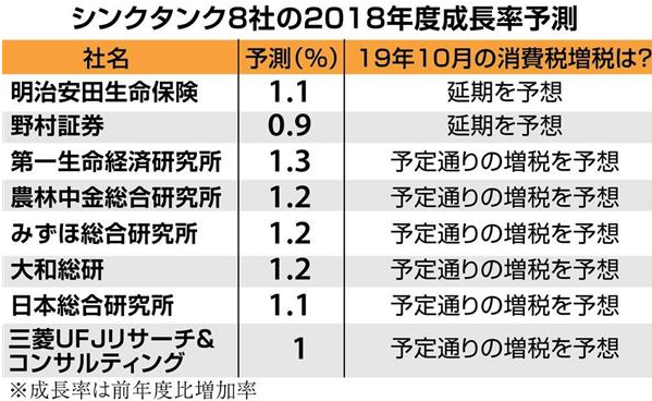 2019年10月に予定される消費税率の8%から10%への引き上げは、みたび延期されるのではないか-。こんな見通しが、市場で上がり始めた。17年4~6月期国内総生産(GDP)速報値の公表を受け、主要シンクタンク8社は18年度の実質GDP成長率予測を公表したが、このうち野村総合研究所と明治安田生命保険の2社は消費税増税を織り込まなかったのだ。安倍晋三首相が悲願の憲法改正を実現するために、内閣支持率を落とす不人気な政策を打ちたくないのでは、との見方が背景にある。