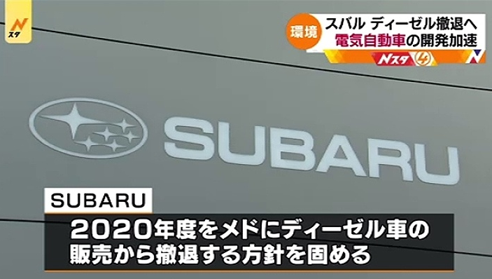 世界でガソリン車やディーゼル車の販売を禁止する方針が発表されるなど環境規制が強化されていることなどから、SUBARUは2020年度をメドにディーゼル車の販売から撤退する方針を固めました。今後、電気自動車などの開発に資源を集中させたい考えで、来年にはアメリカでPHV=プラグインハイブリッド車を、2021年には電気自動車を新たに売り出す方針です。