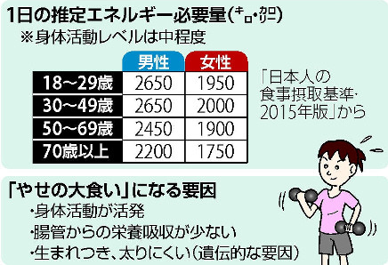 A. 「やせの大食い」ですね。食べ物で体に入る摂取カロリーより、生きていくのに必要なエネルギーのほうが多いと体重は増えません。活発な人は必要なエネルギーも多くなりますが、筋肉の量も大きく関係しています。筋肉はあまり動かなくても多くのエネルギーを使うのです。そのため筋肉質の人は、太りにくいといえます。