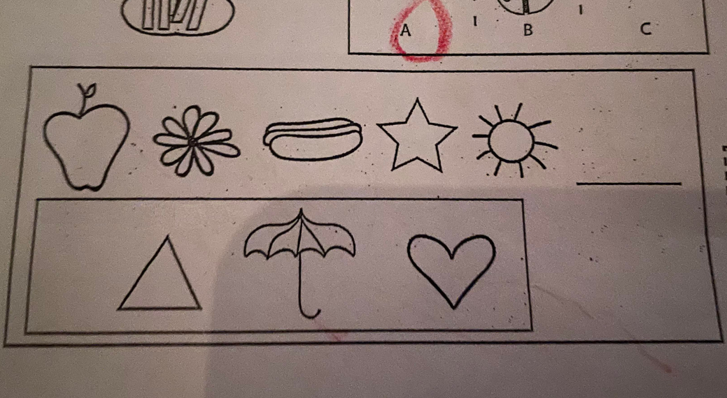 りんご・花・ホットドッグ・星・お日さま、次に並ぶ図形は何でしょうか?