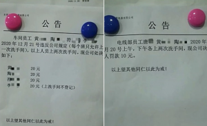 一方、雇用主たちが労働者たちにトイレに関連した措置を取って摘発されたのは、ここだけではありません。 「労働者たちは8分以内にトイレに行って来なければならない」という規則で、8分を超過すると1分当たり20元の罰金を払わせたり、トイレで携帯電話を使えないように接続を遮断しました。
