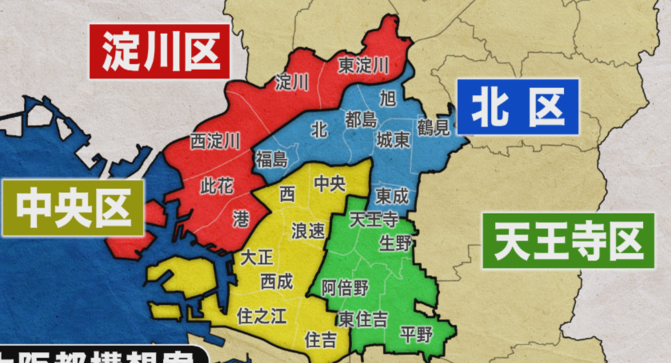 大阪都構想は、大阪市を「北」「中央」「淀川」「天王寺」の4特別区に分割するという計画になっています。11月に予定される市民対象の住民投票で賛成数が多ければ実現される予定になっています。ですがその場合、東京、大阪に「北区」「中央区」という同じ自治体が混在する事態となるのです。
