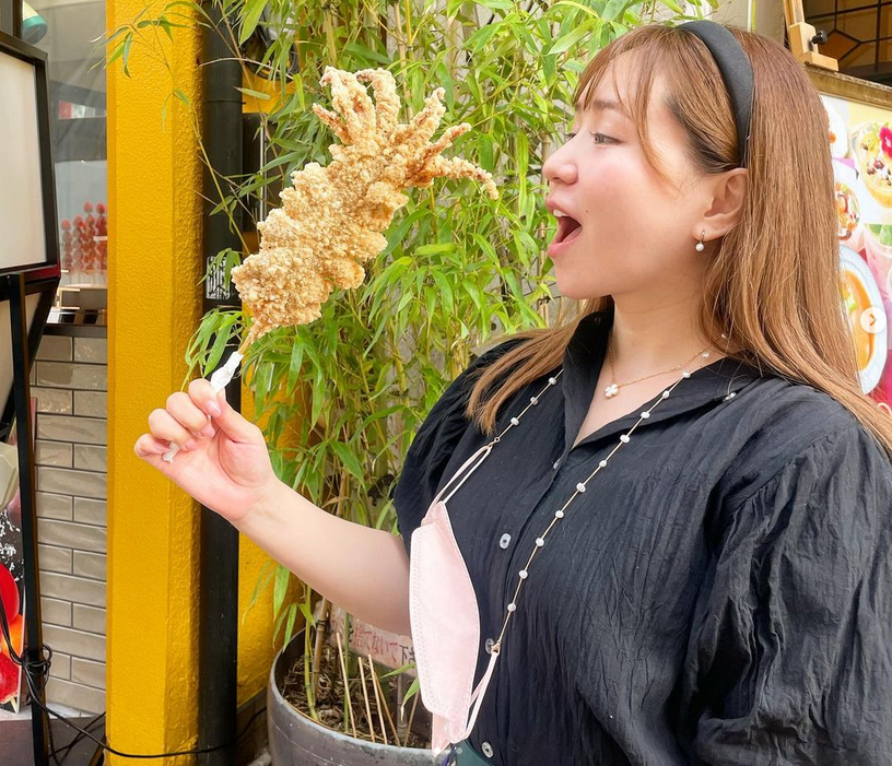 とても大きなイカの唐揚げを手に幸せそうな様子が伺えます。