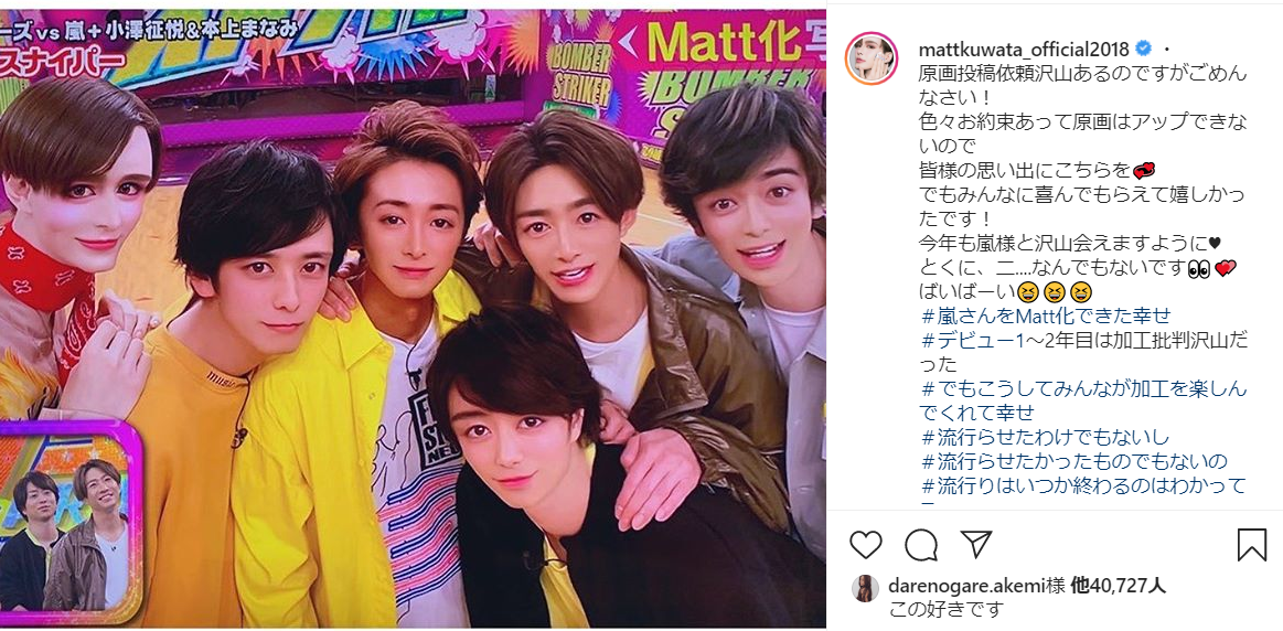 Matt インスタ「嵐の5人をMatt化」 に多くの声が…