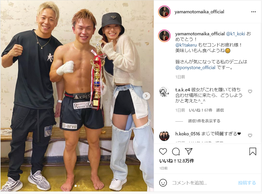 この日、同郷で 仲の良いK-1 キックボクサーの晃貴選手が出場する試合に 応援に駆け付けた山本さんは、晃貴選手の勝利を「おめでとう!」と祝福し、晃貴さん、武尊さんと撮影したスリーショット写真を披露。この日の晃貴さんの試合では、セコンドには武尊さんがついていたといい、山本さんはふたりに労いの声をかけつつ、「美味しいもん食べようね」とつづっていました。