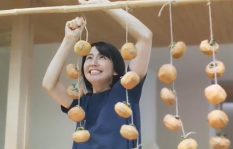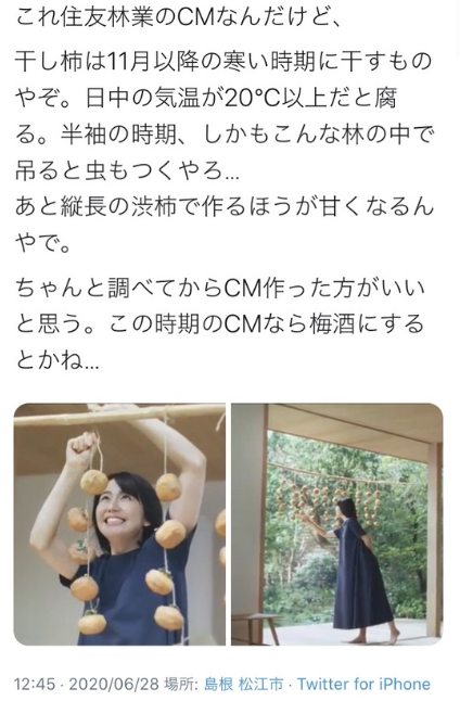 《これ住友林業のCMなんだけど、干し柿は11月以降の寒い時期に干すものやぞ。日中の気温が20℃以上だと腐る。半袖の時期、しかもこんな林の中で吊ると虫もつくやろ… あと縦長の渋柿で作るほうが甘くなるんやで。ちゃんと調べてからCM作った方がいいと思う。この時期のCMなら梅酒にするとかね…》