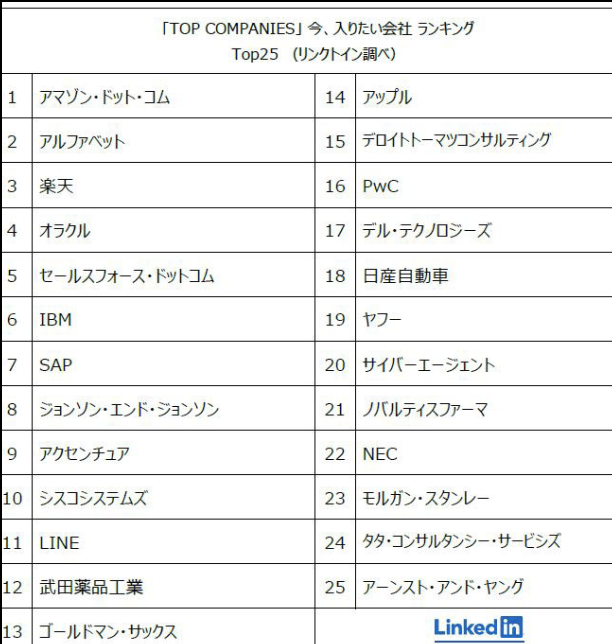 企業の社員のためにより良い環境作りを目指す風潮が強まってきている中、今月3日に、「今、入りたい会社ランキングTOP25」が発表されました。このランキングは、ビジネスに特化したSNSで有名な「LinkedIn」(リンクトイン)が発表したもので、SNS上の実際のユーザーの行動などから抽出しているのが特徴です。このランキングには外資系大手を含むIT関連企業が多く入る結果となりました。