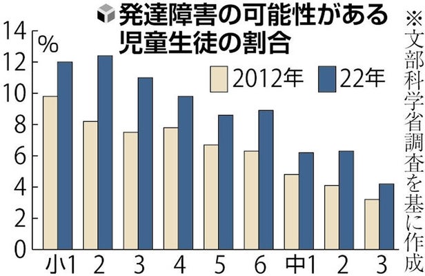 文科省の担当者は増加の要因について、「保護者や教員の発達障害への理解が進み、対象者に気づきやすくなった」と分析しています。学習面などに困難が生じる児童生徒の割合は、学年が上がるほど低くなる傾向があるようです。高校生は今回初めて調査対象となり、発達障害の可能性があるとされた生徒は2.