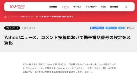 ヤフー株式会社が10月18日、インターネットニュース配信サービス「Yahoo!ニュース」が提供する「Yahoo!ニュース コメント」への投稿において、11月中旬から携帯電話番号の設定を必須化すると発表しました。