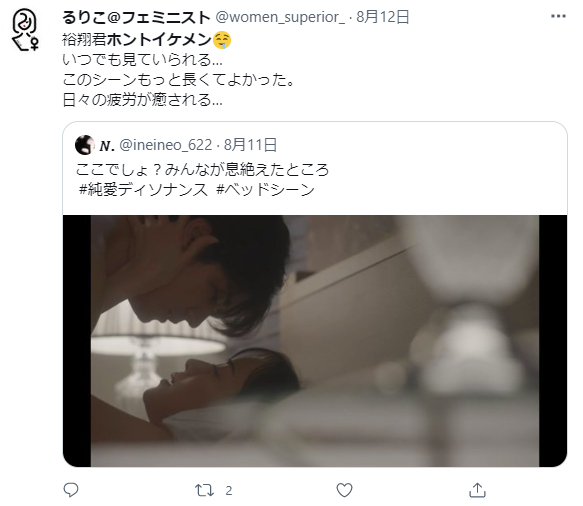 この方はこういうツイートもしながらも、イケメンのベッドシーンにはときめくようです。