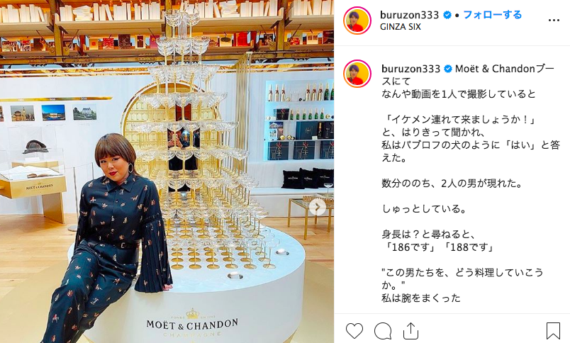 この日、シャンパンを背に「Moët & Chandon」のイベントブースでしっかりとお得意のポーズをきめて撮影した写真を投稿したブルゾンさん。大ブームのときから決めポーズがお得意のブルゾンさんですが、イベントでは「イケメン連れて来ましょうか!」と提案されると、「はい」と答える場面も。