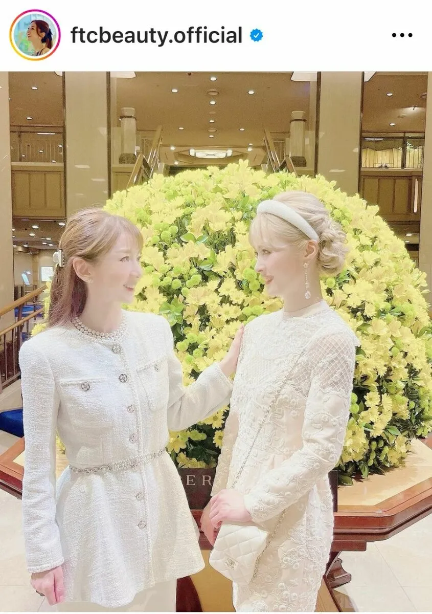 二人とも白の豪奢なワンピースに袖を通しつつも、ヘアメイクがしっかりとしているために清楚というよりはゴージャスな雰囲気が醸しでた写真となっています。さらに画像をかなり明るめに調整していることから、顔のシワは全く見当たらず十和子さんは娘に寄り添っているものの、母親に全く見えないという結果の写真になっています。