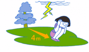 膝を曲げて丸い姿勢でしゃがみ、手で耳の鼓膜を塞ぐように雷雨が過ぎるのを待ちましょう。