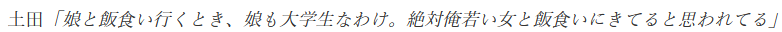 さらには焼き肉店でも目立ってしまったようで、店員がひっきりなしに様子を見に来たと明かしました。また、大学生の年頃でありながら父親の土田さんにベタベタしていたそうで、絶対愛人だと思われてると言及したのでした。