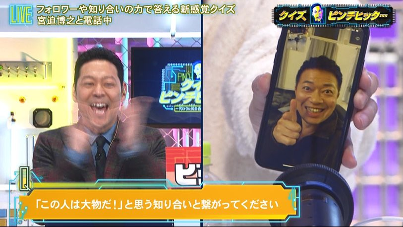 「ロンドンブーツ1号2号」田村淳さんが 、昨年 12月28日の生放送『クイズピンチヒッター』(フジテレビ系)で、「この人は大物だ!と思う知り合いとつながってください」というお題に対し、サプライズで電話したのが宮迫さん。最初は戸惑いながら電話で話していましたが、途中でテレビ電話に切り替えたことで、1年半ぶりに 地上波に復帰したことに…。