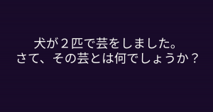 「犬が2匹で芸をしました。 さて、その芸とは何でしょうか?」 問題文をよーく読めば分かるはず! 今回ご紹介するのは脳トレクイズです。 問題 : 犬が2匹で芸をしました。 さて、その芸とは何でしょうか? Google ADVERTISEMENT Google あなたはわかりましたか? それでは答え合わせに行きましょう! Google 答えは、、、「けんけん(犬犬)」 ADVERTISEMENT 犬2匹を漢字で表すと「犬犬」です。犬犬だけに「けんけん」をしました。 けんけん・・・片足で飛び跳ねること。 ADVERTISEMENT Google あなたは間違えずに解けたでしょうか! Google [著作権者VONVON /無断コピー、無断転載および再配布禁止(違反時の法的措置) ADVERTISEMENT