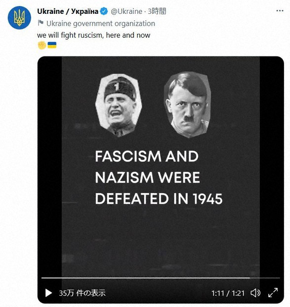 今月24日、Twitterのウクライナ公式アカウントが、ヒトラーと昭和天皇の顔写真を並べた動画を投稿したことについて謝罪したのでした。