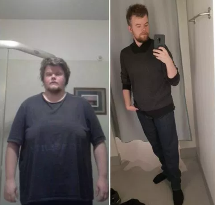 当時25歳、身長163cm、136kgから63kgへ。左は2017年10月で、右は2018年9月。