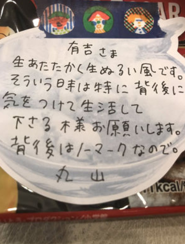 「有吉さま 生あたたかく生ぬるい風です。そういう時は特に背後に気をつけて生活して下さる様お願いします。背後はノーマークなので。丸山」と書かれた手紙の画像を投稿。