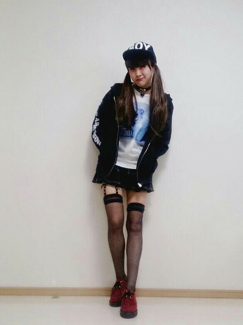 こちらはピンクと黒で統一された可愛い系の着こなしです。