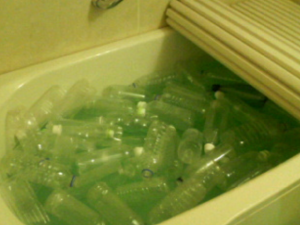 ペットボトルのお湯をためて浴槽に入れておくと、その分浴槽の水位が高くなって水の節約になります。 毎回お風呂に入るには水が必要なので、水節約の方法の一つとしてよく使われます。