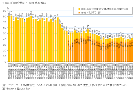 紅白歌合戦は1963年には81.4%を記録しましたが、1986年以降には60%を割り込みました。