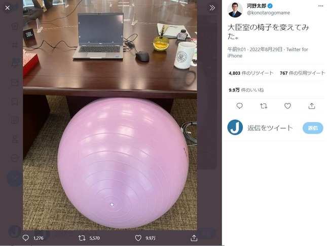 それよりも気になる河野大臣の「揺れ」について、ネット上では話題になっています。記者が「ふわふわと揺れていませんか」と尋ねると、河野大臣はバランスボールに座っているからだと回答。どうやら腰痛防止のため、最近はバランスボールで体幹を鍛えているようです。