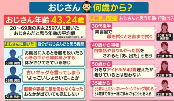 この日、番組では博報堂生活総研「生活定点」が20~69歳の男女2597人に「おじさんだと思う年齢の平均値」を調べた結果、43.24歳だったことを報じました。
